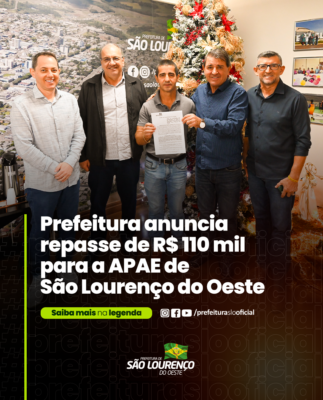 Prefeitura anuncia repasse de R$ 110 mil para a APAE de São Lourenço do Oeste