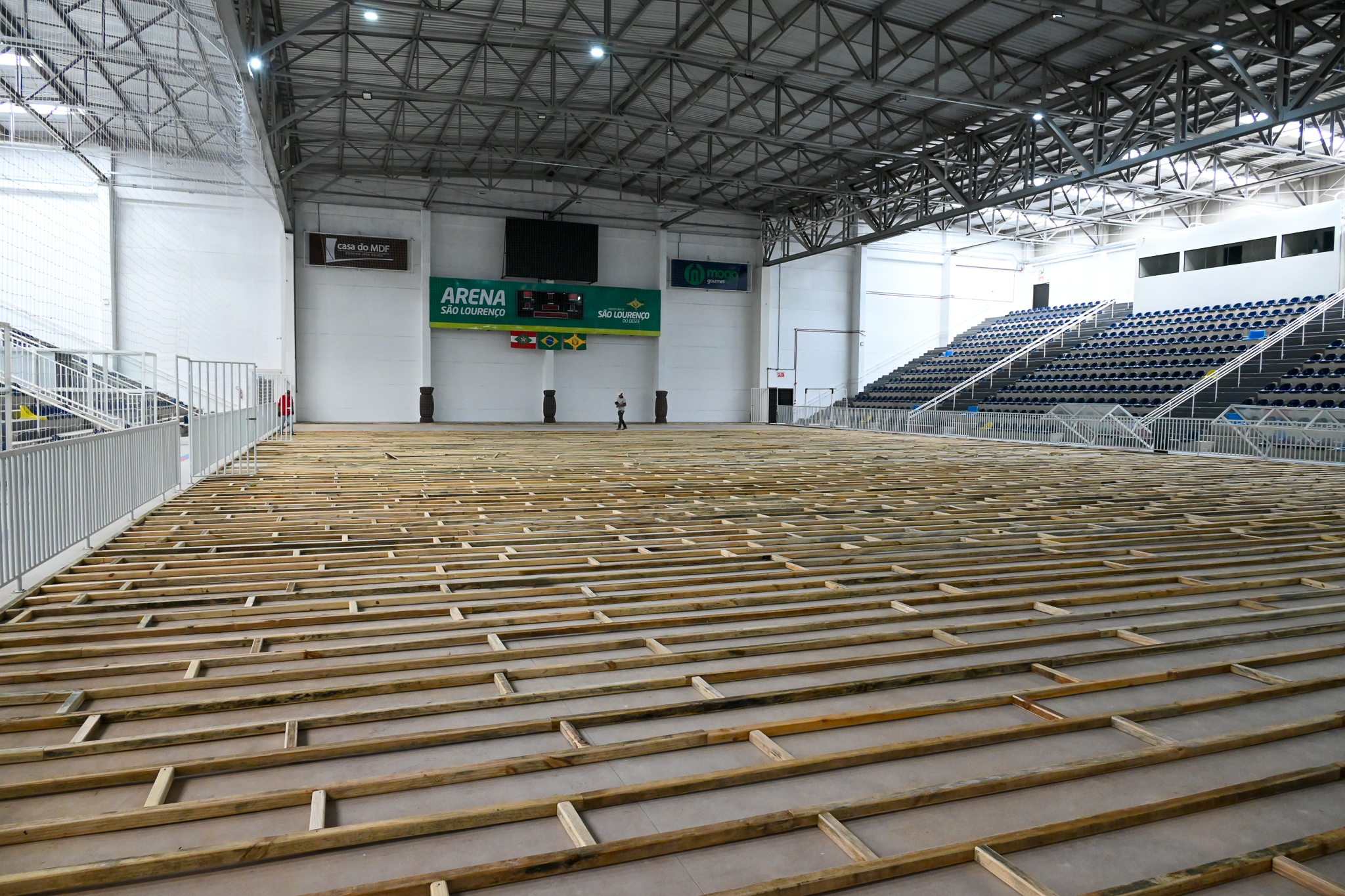 A Arena São Lourenço está recebendo um novo piso, mais adequado para a realização de treinos e jogos de futsal. O revestimento anteriormente instalado no local